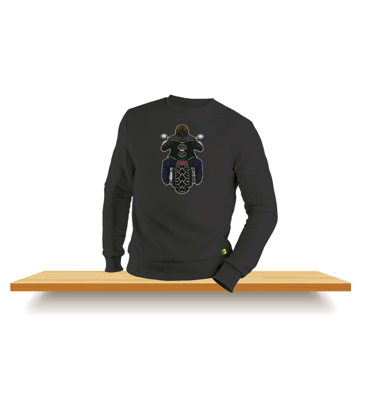 Op deze stoere zwarte sweater zie je de achterkant van een mooie motor. Beschikbaar in de maten XS, S, M, L, XL, XXL.